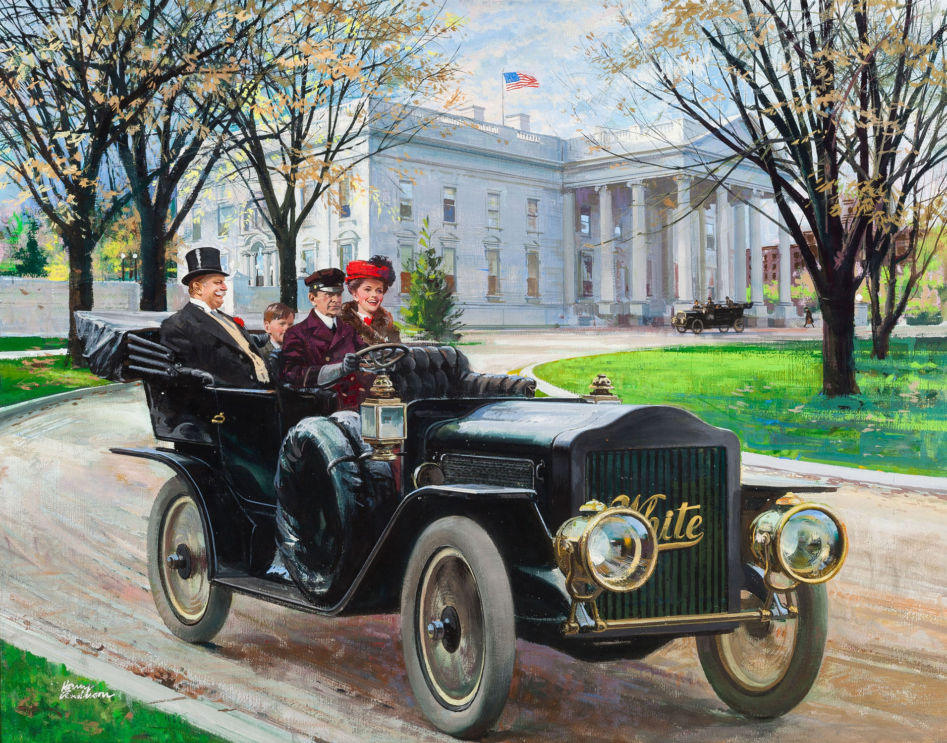 Harry Anderson’s The Chief Executive Goes for a Spin presents President William Howard Taft in a moment of lighthearted modernity, departing the White House in a 1909 White Steamer automobile alongside his wife and son. Smiling and relaxed, Taft is shown not as a distant political figure, but as a husband, father, and participant in a rapidly changing world.