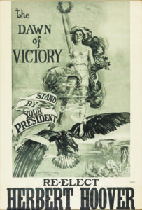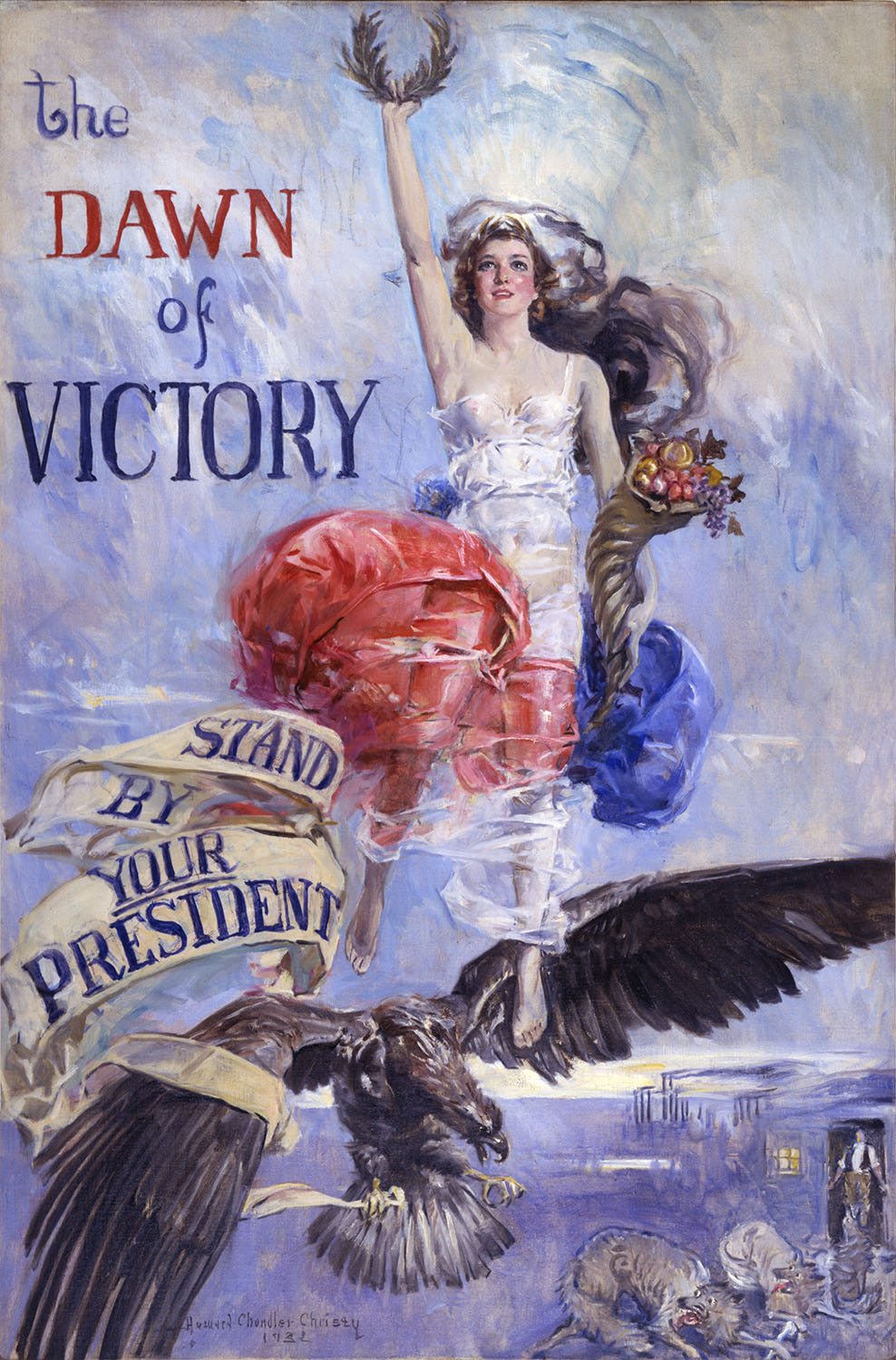 Painted for a Herbert Hoover's re-election campaign poster, Howard Chandler Christy's allegorical image memorializing significant historical events asks voters to "Stand By Your President" in the midst of the Great Depression. An angelic woman draped in red, white, and blue fabric rides on the wings of an eagle, carrying a plentiful horn of fruit symbolizing prosperity in one arm and raising a crown of victory above her head. In the lower right corner scared, hungry wolves are cowering away from the powerful blue-gray eagle (a symbol of the National Recovery act) readying to fight them off. On the other side of the wolves, a man stands in the doorway of American industry. Behind him in the distance are fully operational smoke stacks representing the booming commercial production and economic activity. Christy's use of symbolism in this poster made it an enduring image of Hoover's campaign and of the struggles of the Great Depression. Hoover ultimately lost the election to Franklin D. Roosevelt, who served as President until 1945.