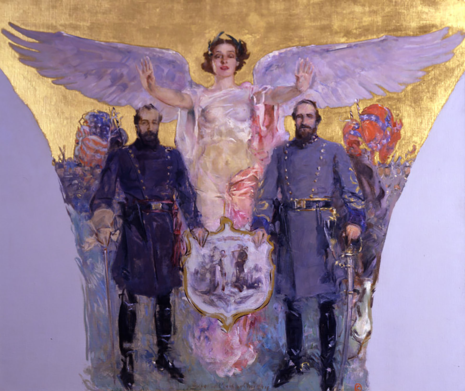In this unrealized study, Howard Chandler Christy envisions a powerful allegory of reconciliation and leadership in the Civil War. An angelic figure with outstretched arms, representing peace and unity, hovers above Ulysses S. Grant, who stands before the Union flag, and Robert E. Lee, positioned before the Confederate banner. Christy underscores how the Civil War defined Grant’s path to the presidency. His leadership during the conflict established him as a symbol of resolve, unity, and victory—qualities that propelled him to the White House and shaped his presidency during the fraught era of Reconstruction.