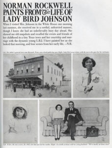 As part of the 1964 Presidential elections, Norman Rockwell interviewed the First Lady candidates, Lady Bird Johnson and Peggy Goldwater, and illustrated several images from each of their lives for McCall’s. Here, Rockwell has painted Lady Bird Johnson’s “father’s general store near Karnack, Texas… a local gathering spot.” These illustrations, along with a short paragraph about his interaction with the women allowed the public to understand the background of each of the potential First Ladies. In addition to her father’s store, Rockwell portrayed Lady Bird as an infant with her nurse, a mourning child over the loss of her mother, and as a young newly wed. Ultimately, Lyndon B. Johnson won the election by a landslide, only losing in 6 states, and the couple remained in the White House until 1969.