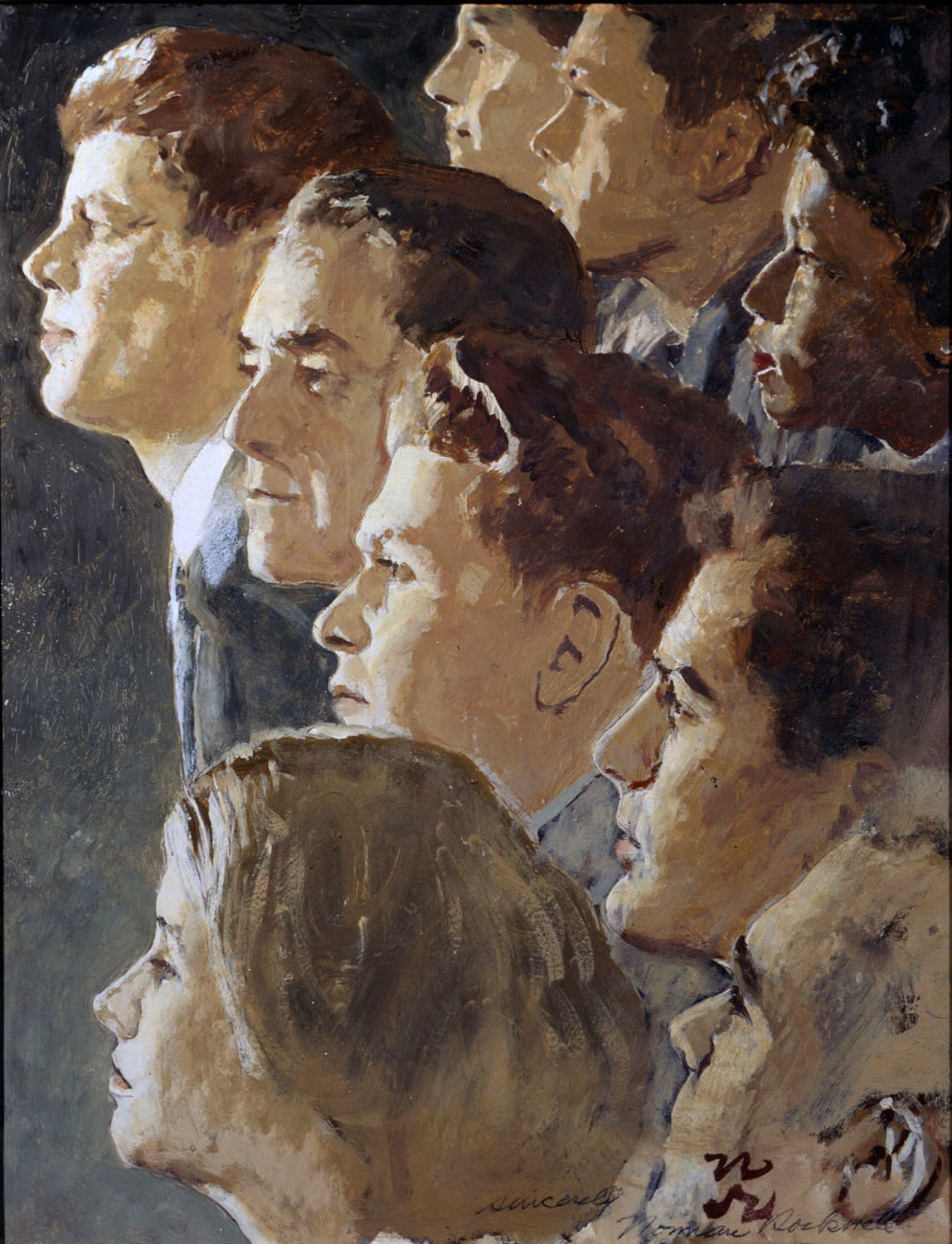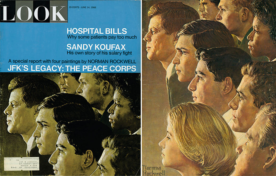 Look magazine highlighted the accomplishments of Peace Corps volunteers in the program’s first five years through four illustrations of actual volunteers at work. Rockwell struggled with this important commission, writing to Allen Hurlburt, Look’s art director: “Every so often I find I have a subject that I wholeheartedly want to paint but I can’t make up my mind just how to paint it, and this is one… I want to say that these young people, led by Mr. Kennedy, are unselfishly going on a crusade.” For the magazine’s cover and article’s first image, Rockwell painted this group portrait of John F. Kennedy leading actual Peace Corps volunteers steadfastly forward into a warm, unseen light, as Kennedy’s inaugural speech described. Similar to his Freedom of Worship layout, Rockwell found success depicting a diverse group of people coming together for one central cause by showing each person in profile, focused on the same point ahead. The viewer is able to read and reflect upon the individual emotions of each character while not losing focus on the larger issue being addressed. Next to Kennedy is his brother-in-law Sargent Shriver, the first director of the Peace Corps.