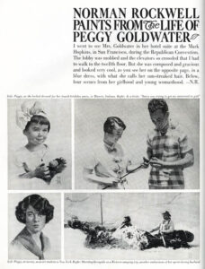 In the 1964 Presidential election, Barry Goldwater, known as a very conservative senator from Arizona, ran against Lyndon B. Johnson, who was running for his first term after assuming the Presidency following President John F. Kennedy’s assassination. Norman Rockwell interviewed the First Lady candidates, Lady Bird Johnson and Peggy Goldwater, and illustrated several images from each of their lives for McCall’s. Here, Rockwell illustrates Peggy and her husband, Barry, “shooting the rapids on a Western camping trip.” Other images showed Peggy as a girl on her fourth birthday, a beautiful young woman, and learning to play sports with her husband. These illustrations, along with a short paragraph about his interaction with the women allowed the public to understand the background of each of the potential First Ladies. Ultimately Barry Goldwater lost the election in a landslide to Lyndon B. Johnson and resumed his position as Arizona State Senator in 1969.