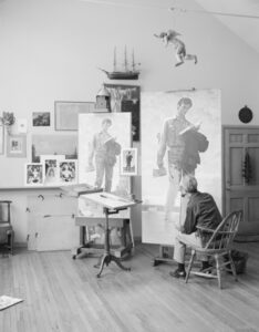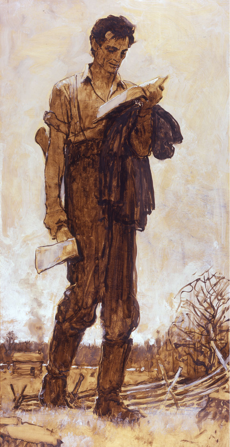 “Undoubtedly, Rockwell was familiar with [Carl] Sandburg’s account of Lincoln as a surveyor and most likely he based his now famous literary image of the young Abraham Lincoln from the biography. Lincoln the Railsplitter illustrates Lincoln engrossed in reading a surveying text held in one hand while bearing an axe in the other. There is no mistaking that the scene is a reflection of that moment of transition in the maturity of Lincoln from woodman to statesman… Viewed from below, Lincoln appears larger than life, with the expanse of farmland not yet developed serving as a background to the iconic president.” From Laurie Norton Moffat’s catalogue entry for Lincoln the Railsplitter.