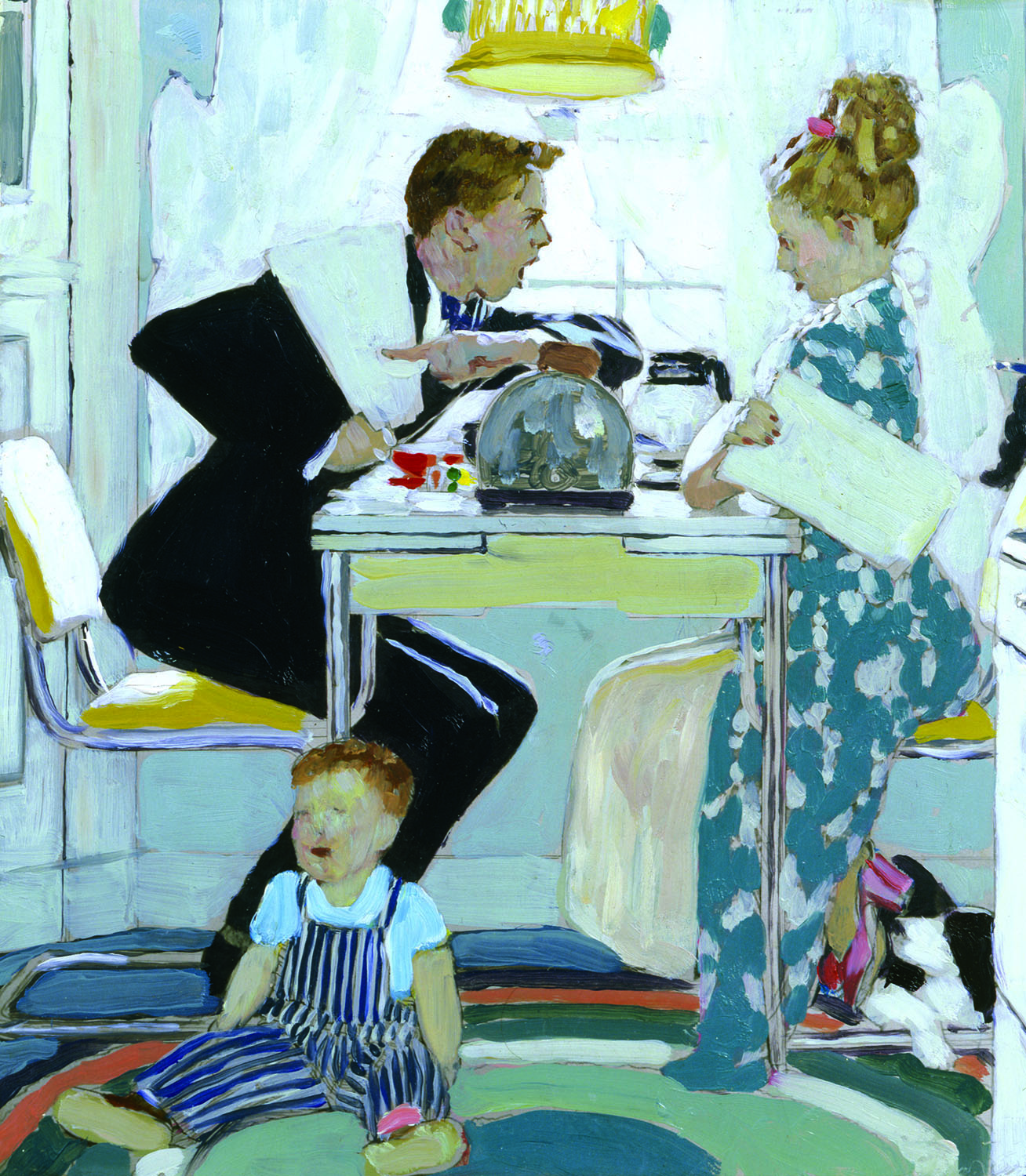 The 1948 Presidential Election was to mark a turning point for the Republican Party, as the Democratic Party seemed weak and unstable. Rockwell's Breakfast Table Political Argument reflects the battle between Thomas Dewey and Harry Truman for the Presidency of the United States. The husband, dressed in a suit for work, shouts fiercely at his wife seated across from him, who pouts sullenly and stubbornly with folded arms. The husband points at the magazine cover showing his support for Dewey, while his wife holds a publication showing her support for Truman. Both are so involved in the debate over their respective candidates that neither notices the upset child at their feet or the hungry dog in the corner. Breakfast Table Political Argument is witty and charming in their depiction of a suburban American lifestyle, a classic example of Rockwell’s traditionally entertaining approach to the world around him.