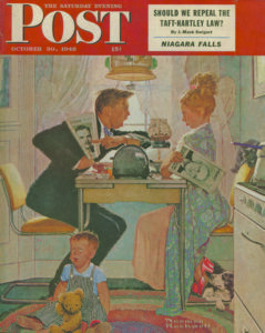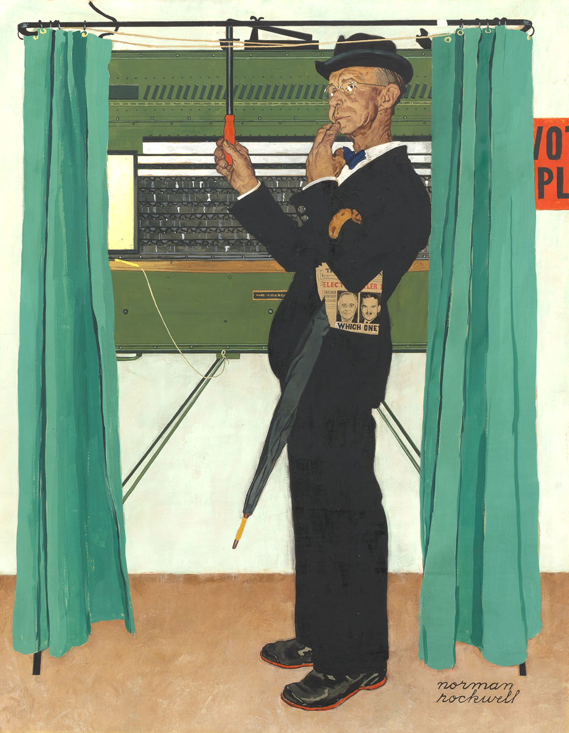 In the wake of the 1944 election between incumbent Democratic President Franklin D. Roosevelt and Republican candidate Thomas E. Dewey, Rockwell, along with the rest of the country, eagerly anticipated the results in the midst of World War II. To mark this time of political tension, he painted a gentleman entering the voting booth just before the curtain is drawn, debating his decision. The newspaper folded in his pocket shows a portrait of each candidate above the heading “Which One?” Ultimately, Roosevelt won his record-breaking fourth Presidential election with 53.39% of the popular vote, although he would die just three months into the term, leaving the office to his Vice President, Harry S. Truman.