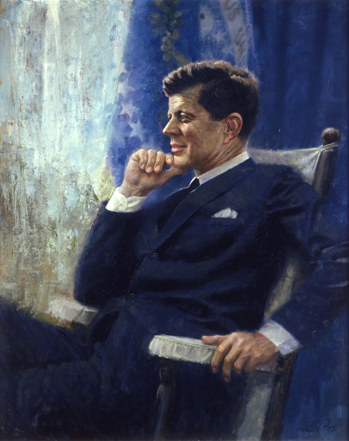 In this contemplative portrait, Alex Ross depicts President John F. Kennedy seated in profile within the Oval Office, the presidential flag standing quietly behind him. Rendered with restraint and clarity, the composition emphasizes reflection rather than spectacle, presenting Kennedy as a thoughtful leader bearing the weight of history and responsibility. The painting invites viewers to consider leadership not only as public performance, but as a deeply private act of decision-making—one that would define an era and resonate long beyond Kennedy’s lifetime.