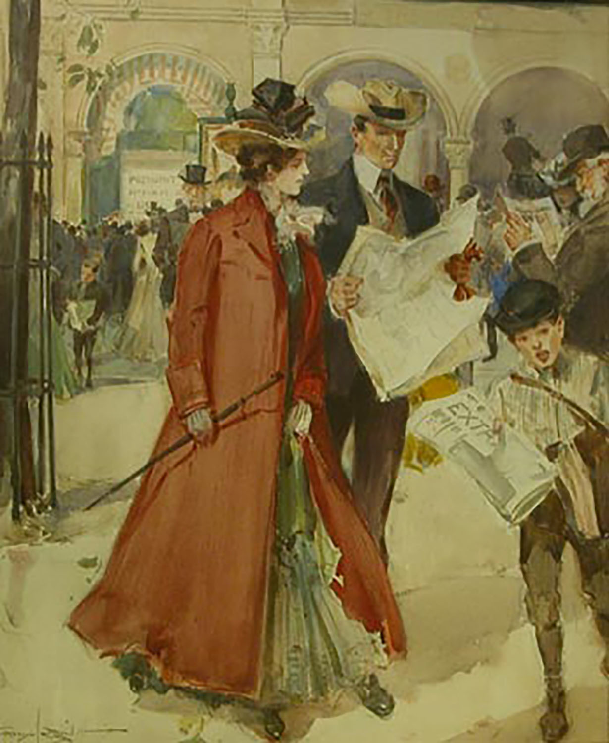 Walter Granville Smith’s striking magazine cover captures the shock and immediacy of a nation in crisis following the assassination of President William McKinley in 1901. Set on a crowded city street, a paperboy thrusts newspapers toward the viewer, the devastating headline—“Extra! President McKinley Is Dead!”—cutting through the everyday bustle of American life. The surrounding figures, dressed in the typical attire of the era, freeze the moment in time, emphasizing how suddenly tragedy intruded upon the ordinary rhythms of the nation.