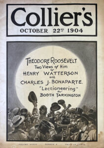 J.C. Leyendecker’s compelling cover for the October 22, 1904 issue of Collier’s captures the charged political atmosphere surrounding Theodore Roosevelt’s bid for re-election. Published just two weeks before the presidential vote, the image appeared beneath the headline “Theodore Roosevelt: Two Views of Him,” which introduced dueling articles by Henry Watterson and Charles J. Bonaparte—each offering sharply different assessments of Roosevelt’s leadership and policies.